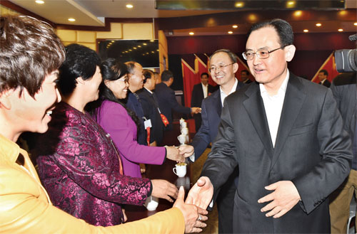 10月12日晚,市委書記李俊明、市長鄭連生等市領導到駐地看望參加市政協四屆一次會議的委員。(本報記者 馮曉磊 范濤 攝)