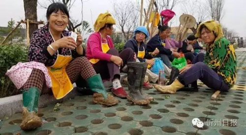 《綠化娘子軍的早餐》,在忻州一中北校區,戰斗了一個早晨,搶時間、搶速度進行植樹的康培綠化公司的娘子軍在吃早飯,補充體力。(黃濤 攝)