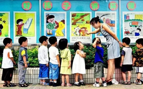 《從小教育》拍于原平市。幼兒園老師在環保宣傳欄前,教育幼兒園的孩子們從小養成熱愛環境衛生。(楊紅 攝)