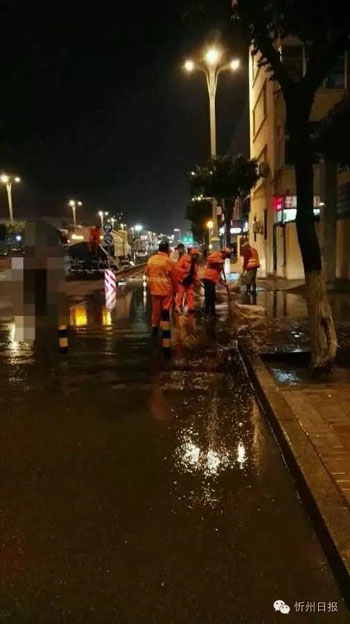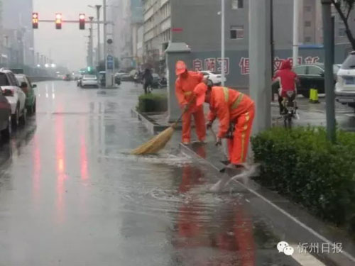 《創衛先鋒》,街頭的環衛工人冒雨工作,大雨中最美麗的身影。(班博然 攝)