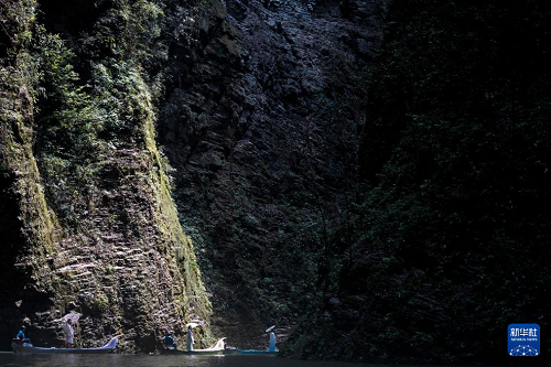 7月9日,游客在鶴峰縣屏山峽谷體驗游船項目。(新華社發 趙軍 攝)
