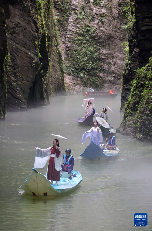 7月9日,游客在鶴峰縣屏山峽谷體驗游船項目(無人機照片)。(新華社發 趙軍 攝)