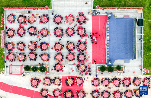 10月29日重陽節,老人們在湖北省秭歸縣兩河口鎮太坪村參加長壽宴(無人機照片)。(新華社發 王罡 攝)