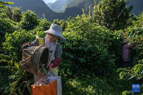 11月16日,咖農在云南省保山市隆陽區新寨村一處咖啡園采摘咖啡果。(新華社記者 高詠薇 攝)