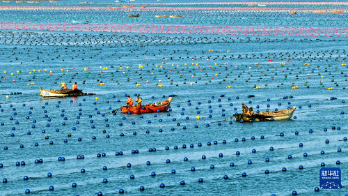 11月19日,在山東省榮成市愛倫灣海帶養殖區,工人進行海帶播苗作業(無人機照片)。(新華社發 李信君 攝)