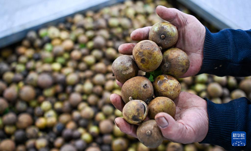 這是在海南省白沙黎族自治縣邦溪鎮(zhèn)的聞儒生物科技(海南)有限公司內(nèi)等待加工的油茶果(11月19日攝)。(新華社記者 楊冠宇 攝)