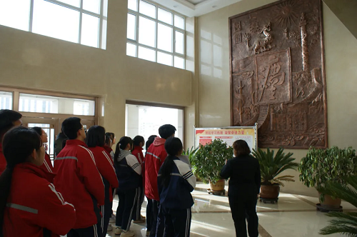 “同學們,這是繁體字‘灋’,由三個要素構成,左半部分是‘水’,右上角是‘廌’,右下角為‘去’。水象征著法律的公平與正義,廌也叫‘獬豸’,它是一種一只角的神獸,能夠分辨人間是非……”法院干警為同學們耐心講解浮雕墻的細節,佇立聽講,頻頻點頭中,小小的“法治”種子也在此刻生根發芽。