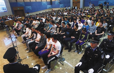 因為被告人太多,法院最大的法庭也無法容納。開庭前法院已將最大法庭前4排旁聽席的座位拆下,以擴大審判區的面積,同時從兄弟法院協調了法警30人,出動了12輛警車接送被告人。