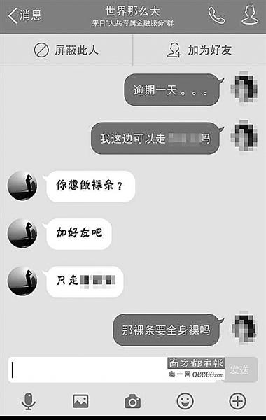 13日,記者調(diào)查發(fā)現(xiàn),在一些借款群中,女大學(xué)生“裸持”借款已經(jīng)成為公開的秘密,通過“裸持”可以借款的金額是普通借款額度的2至5倍,但逾期未還將面臨裸照被公布的威脅,甚至有借款人威脅“裸持”借款的女生提供性服務(wù)。