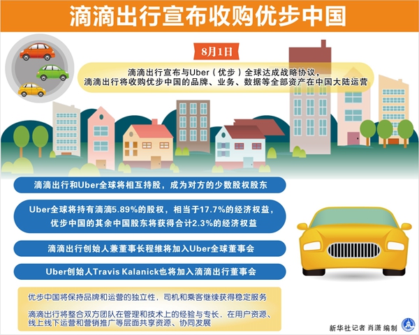 1日,滴滴出行宣布與Uber全球達(dá)成戰(zhàn)略協(xié)議,滴滴出行將收購優(yōu)步中國的品牌、業(yè)務(wù)、數(shù)據(jù)等全部資產(chǎn),在中國大陸運營。