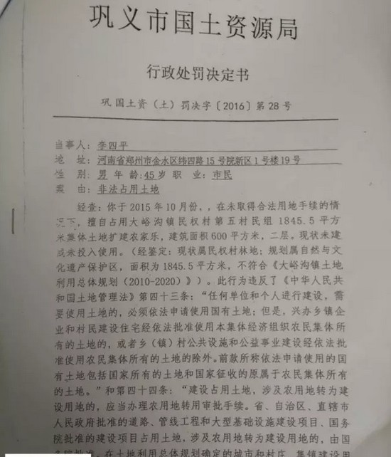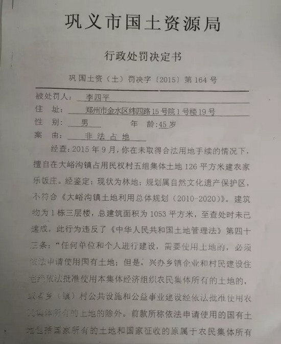 據記者獲取的材料顯示,2015年12月份,鞏義市國土資源局對李四平進行處罰,案由為“非法占地”。李四平擅自占用集體土地126平方米,建設農家樂,土地性質為林地。對其處罰為“自行拆除在非法占用的126平方米土地上新建的建筑物和其他設施,恢復土地原狀”“對非法占用的126平方米土地,按每平方米3元處以罰款,共378元?!?/p>