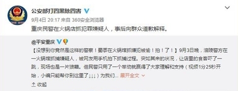 近日,一則警方在餐館內抓捕犯罪嫌疑人的視頻在網上流傳。視頻顯示,在激烈的抓捕行動結束后,一名身著便衣的人向餐館內所有客人示意并道歉,贏得現場喝彩。視頻被發布到網絡后獲得大量網友點贊,公安部官方微博也轉發了該視頻。