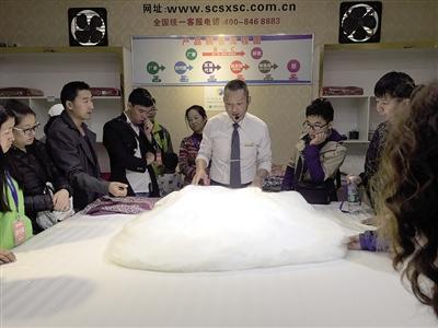 下午2點半,按照行程,旅行團將參觀蜀繡,旅行團被帶往一家門口寫有“蜀繡蜀錦科技文化展示中心”字樣的單位,但這家單位實際上是名為“依格爾”的床上用品直銷工廠。講解員簡單講解了有關蜀繡蜀錦的知識后,就把游客帶往一個展覽廳,向游客推介他們工廠的蠶絲床上用品,價格從3980到6980元不等。