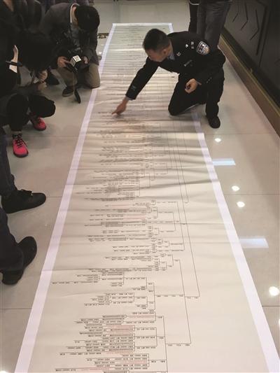 當時公安信息化不是很發達,家譜上的姓名和公安機關戶籍系統中的姓名有出入。民警將上千名家譜中的男性逐一翻拍,回南京后再根據翻拍的家譜照片,按照每一個人的血緣、親緣、家庭關系,逐人核對、逐人梳理。由于當地家族成員關系非常復雜,民警足足耗時兩個多月,制作出了一份長達6.8米的家譜關系圖。