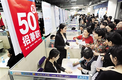 23日上午11點,重慶市江北區觀音橋一家人才招聘市場內,一個掛著“五十萬招兼職”海報的招聘展位前人頭攢動。排隊等候填表報名的人將兩米寬的過道塞得滿滿當當。