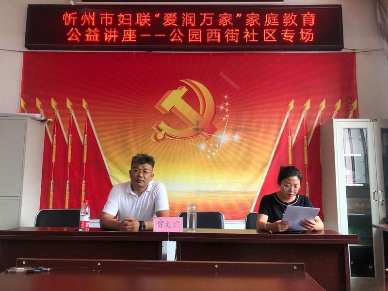 7月22日下午,忻州市長征小學組織三年級30余名學生家長在世紀花苑物業三樓參加了由忻州市婦聯組織的“愛潤萬家”家庭教育公益講座,講座由心理學研究中心賀文廣會長主持。