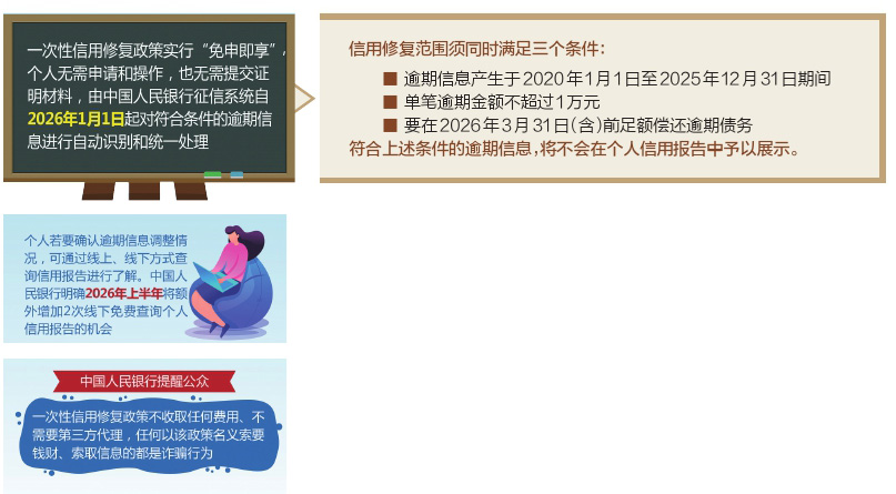 在進行必要的技術準備后,中國人民銀行于22日明確發布一次性信用修復政策有關安排。自2026年1月1日起征信中心將根據不同還款情形完成自動調整,相關逾期記錄不再在個人信用報告中展示。