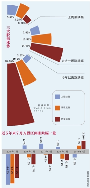 新京報記者統計了2010年7月-2019年7月間的數據發現,事實上,指數在過去的10年中上漲與下跌的各約占半數。其中,滬指方面,近10年里,滬指6次在7月出現上漲,4次出現下跌。2010年7月為近10年的7月里上漲幅度最高的一年,漲幅為9.97%;2015年7月,滬指大幅下跌14.34%,是十年中7月跌幅最高的一年。