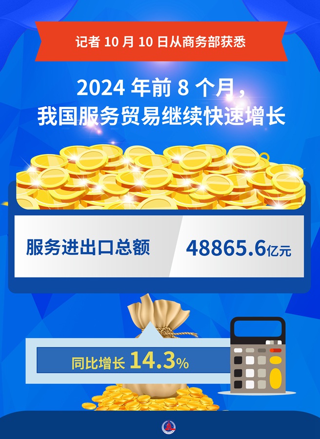 新華社北京10月10日電(記者謝希瑤)記者10日從商務部獲悉,今年前8個月,我國服務貿(mào)易繼續(xù)快速增長,服務進出口總額48865.6億元,同比增長14.3%。