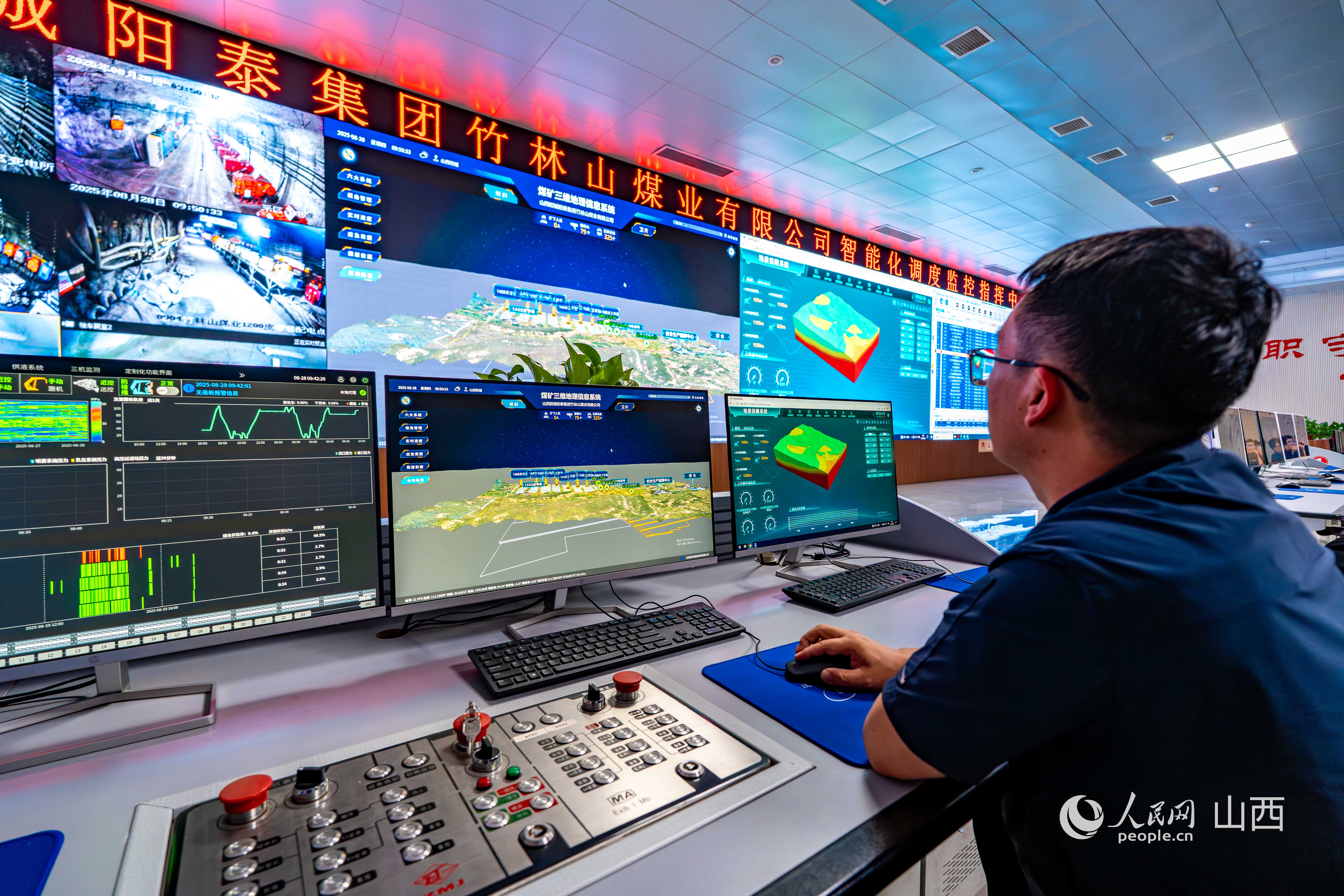 陽泰集團(tuán)竹林山煤業(yè)有限公司智能化調(diào)度監(jiān)控指揮中心。人民網(wǎng) 馬夢迪攝