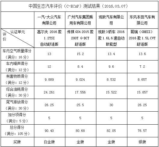 人民網天津3月9日電(鄂智超)日前,中國生態汽車評價(C-ECAP)新一批測試結果公布。本次共公布了四款車型,分別為一汽-大眾高爾夫 2016款 1.2TSI自動舒適版(90.40分)、廣汽傳祺GS4 2015款 200T G-DCT舒適版(80.68分)、觀致3轎車 2016款1.6L 6速自動致能型(82.05分)、東風本田哥瑞 2016款1.5L CVT舒適版(76.57分)。其中一汽-大眾高爾夫車型獲得白金牌,廣汽傳祺GS4與觀致3轎車獲得金牌,東風本田哥瑞獲銀牌。