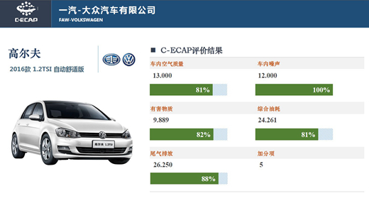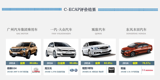 在本批次C-ECAP評價中,一汽-大眾高爾夫車型獲得截止至目前C-ECAP評價車型中的最高獎牌白金牌;廣汽傳祺是在C-ECAP中首次出現的中國品牌,與觀致車型一并獲得金牌;東風本田哥瑞因在車內噪音方面的相對得分較低,獲得銀牌。