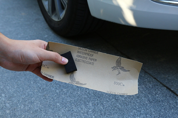開始補漆作業,先清洗劃痕位置以及周圍地方。先用800的砂紙進行打磨,墊上一塊墊木沾一些水,可以更好掌握砂紙打磨時的力度。將劃痕處的漆面以及傷痕打磨平整并再次清洗擦干。