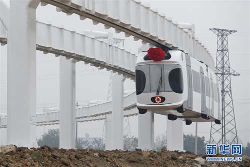 11月21日,在四川成都雙流西南航空港經(jīng)濟(jì)開發(fā)區(qū),附近群眾觀看在試驗線上運行的新能源“空鐵”。當(dāng)日,由中唐空鐵聯(lián)合多家單位研制的新能源懸掛式空中軌道交通試驗線,經(jīng)過近兩個月的試驗與調(diào)試運行,各項指標(biāo)達(dá)到設(shè)計要求。下一步將對新能源“空鐵”進(jìn)行全面系統(tǒng)的運營測試,進(jìn)而為制定相關(guān)技術(shù)標(biāo)準(zhǔn)和示范線建設(shè)奠定基礎(chǔ)。新華社記者 江宏景 攝