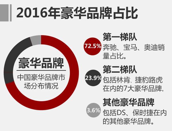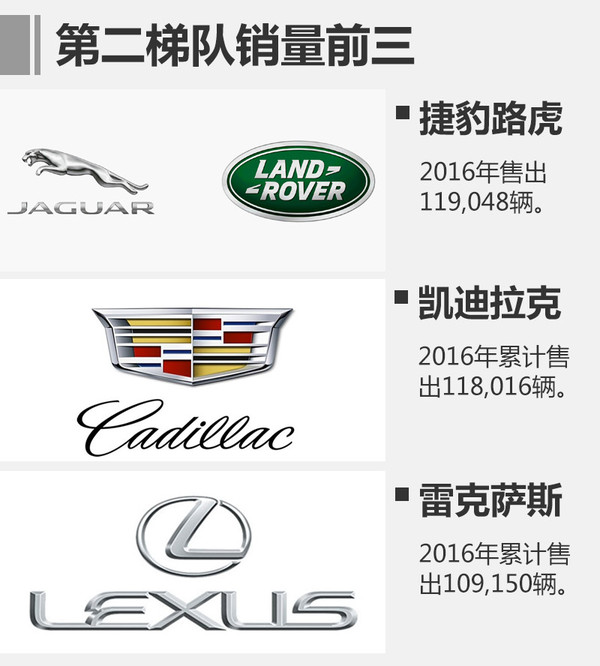 而包括捷豹路虎、凱迪拉克、雷克薩斯、沃爾沃、英菲尼迪、林肯和謳歌組成的豪華品牌第二梯隊,2016年總銷量為520,354輛,占整個豪華車市場23.9%。注:保時捷品牌定位問題,不算在第二梯隊內。