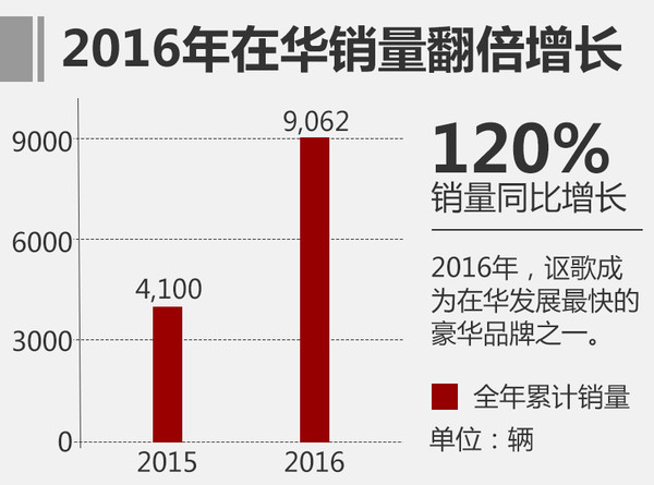 由于此前在華的產品投入等多方問題,入華已經達到10年的本田高端品牌謳歌,銷量并沒有得到顯著提升,2015年謳歌在中國市場的新車上牌量僅為4,100輛,數據并不美麗。2016年謳歌重整旗鼓,制定完善的在華戰略,推出首款國產車型CDX后其銷量得到明顯提升,2016年累計售出9,062輛,同比大增120%,成為增速第二快的豪華品牌。