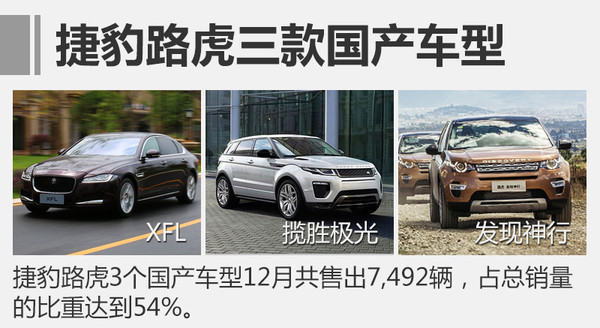 捷豹路虎去年能夠超越自我,實現(xiàn)新的銷量記錄,國產(chǎn)車型成為最重要因素。剛剛結束的2016年12月,捷豹路虎在華共售出13,859輛,與2015年同期(10,227輛)相比大漲36%。其中,捷豹路虎在華合資公司生產(chǎn)的3款國產(chǎn)車型捷豹XFL、路虎極光、發(fā)現(xiàn)神行,12月共售出7,492輛,占總銷量的比重達到54%。