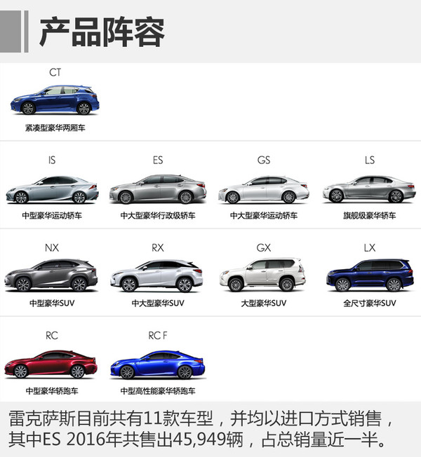 2016年12月,雷克薩斯共售出10,662輛,同比增長5.3%;1-12月累計銷量達109,150輛,已經(jīng)超額完成10萬輛的銷量目標。在各大豪華品牌不斷加深國產(chǎn)化進程的現(xiàn)階段,雷克薩斯自2004年建立獨立經(jīng)銷商網(wǎng)絡后,一直保持以進口方式銷售的豪華品牌。在十多年的發(fā)展中,其產(chǎn)品矩陣越來越豐富。