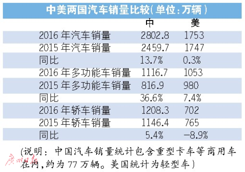 不被看好的2016年車市,在上半年“低開”之后,硬是憑借下半年的“高走”,實現全年逆襲。2016年,中國車市交出漂亮成績單,全年產銷分別完成2811.9萬輛和2802.8萬輛,比上年同期分別增長14.5%和13.7%,高于上年同期11.2和9.0個百分點。這一成績單,讓中國車市毫無懸念蟬聯全球第一大市場寶座,并再創歷史新高,自2009年超越美國成為全球第一大市場之后,中國再未讓這頭銜旁落。2016年,盡管美國市場創出1753萬輛的新高,但與中國差距已經拉大至1049萬輛。