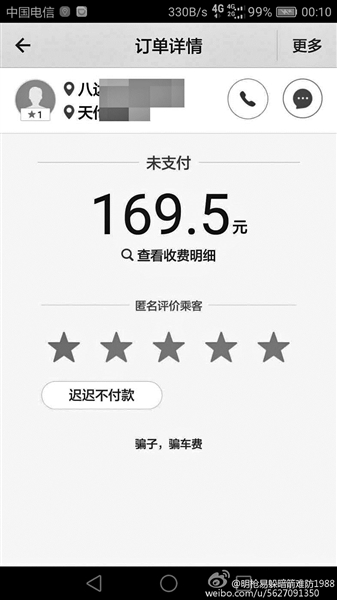 在某網站論壇上,一名順風車司機爆料說,晚上下班后接了一單滴滴順風車,想著反正順路,上班路上接一單抵個油費也是好的。送到目的地后,自己出于習慣讓乘客先下車后付款,沒想到對方是用小號注冊的滴滴賬戶,晚飯后再打電話已經是“空號”。“這顯然是惡意打霸王車啊。”