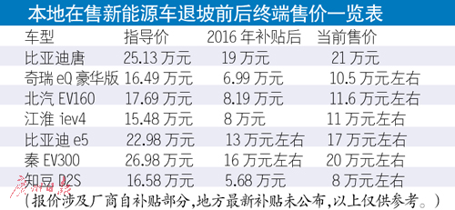 車天下記者近日走訪廣州本地市場看到,受到補貼減少的新政影響,新能源汽車出現價格上漲態勢。記者在北汽、奇瑞、比亞迪等新能源車銷售店里看見,一些新能源車車型已經調價。一輛原本在去年補貼后售價為6.28萬元的純電動汽車,現在掛出來的售價為9.88萬元,上漲將近一半多;比亞迪旗下多款續航里程在300公里以上的新能源汽車,平均上調4.4萬元。
