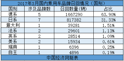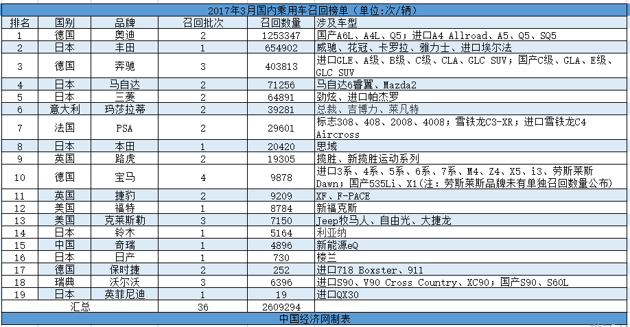 根據國家質檢總局缺陷產品管理中心3月份發布的召回公告,中國經濟網汽車頻道經過匯總、統計,整理出“3月國內乘用車召回榜單”。3月份,中國汽車市場內共有21個汽車品牌發布了累計36次召回公告,共計召回2609294輛汽車。