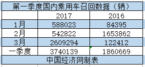 2016年,國內乘用車召回數量首次突破一千萬輛,達到11331565輛。進入2017年,國內乘用車召回數量繼續井噴,今年一季度累計召回汽車3740139輛,同比2016年一季度的1860669輛增長了101.01%。