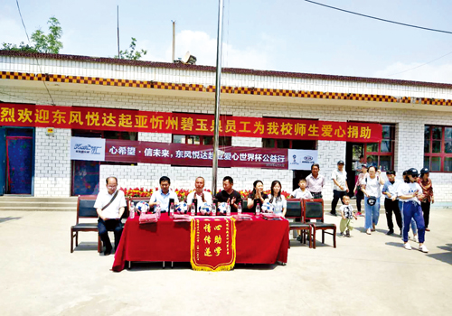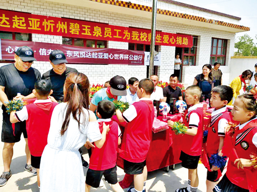 2018年6月2日“心希望信未來”東風悅達起亞世界杯公益行活動如期成功舉行。本次活動由東風悅達起亞廠家冠名支持,由忻州碧玉泉公司員工、部分保有客戶及家屬、意向客戶及媒體工作人員共60多人和代縣兩界溝小學全體師生共同參與。