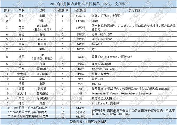 根據國家市場監督管理總局缺陷產品管理中心1月份發布的召回公告,經濟日報-中國經濟網汽車頻道經過匯總、統計,整理出“2019年1月國內乘用車召回榜單”。1月,國內乘用車市場發布19起召回公告,共涉及19個品牌的644636輛汽車,同比增長93.12%,環比增長33.81%。