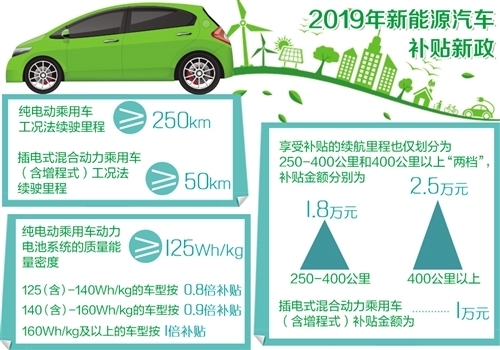 2019年新政提出:純電動乘用車工況法續駛里程不低于250公里,插電式混合動力乘用車(含增程式)工況法續駛里程不低于50公里,享受補貼的續航里程也僅劃分為250至400公里和400公里以上“兩檔”,補貼金額分別為1.8萬元和2.5萬元,插電式混合動力乘用車(含增程式)補貼金額為1萬元。