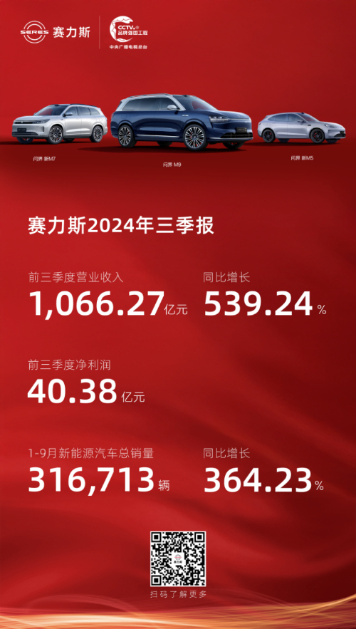 10月30日,賽力斯(601127.SH)發布2024年三季報,前三季營收1066.27億元,同比大增539.24%;歸屬于上市公司股東的凈利潤40.38億元。
