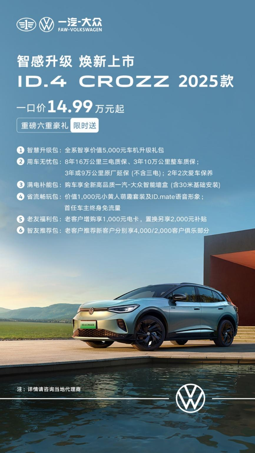 一汽-大眾ID.4 CROZZ作為MEB專屬純電平臺打造的純電汽車產品,憑借超高標準的整車安全、純正德系操控、真實續航及舒享空間,深受消費者喜愛。隨著2025款產品的推出,一汽-大眾ID.4 CROZZ將繼續為用戶提供更安全、更可靠、更智能的電動出行體驗,共同開啟更加美好的出行新世界。