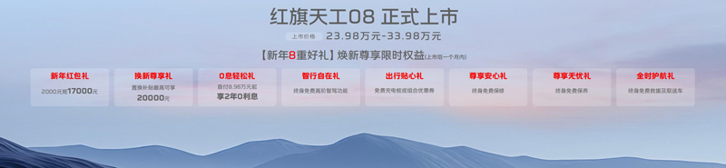 逐夢新程,臻享超值。天工08共推出兩驅和四驅2種驅動模式共5個版本供選擇,官方指導價為23.98萬元-33.98萬元。同時,購買天工08的消費者還可尊享“新年8重好禮”限時權益,即刻購車可享2000元抵17000元的新年紅包禮;置換補貼最高可享20000元的換新尊享禮;首付8.98萬元起、享2年0利息的0息輕松禮;終身免費高階智駕功能的智行自在禮;免費充電樁或組合優惠券的出行貼心禮;終身免費保修的尊享安心禮;終身免費保養的尊享無憂禮;終身免費救援及取送車的全時護航禮。從購車成本到金融方案,再到智駕裝備、質量保障等方方面面,紅旗以超值權益帶來進階的價值體驗,讓用戶買得舒心、用得安心。
