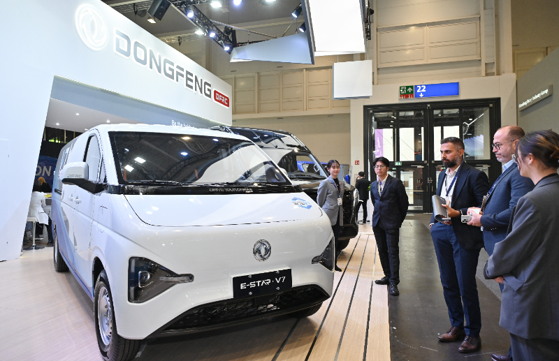 (資料圖片)2024年9月16日,在德國漢諾威國際交通運輸博覽會媒體預展上,人們在東風汽車展區參觀E-STAR V7商用車。新華社記者 任鵬飛 攝