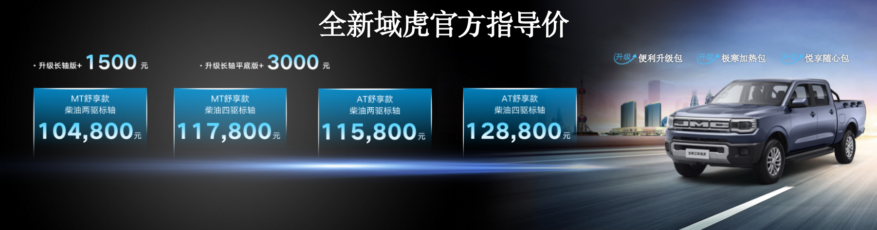 超級(jí)好用:能裝、好用、抗造 1.6m3載物容積,配合后排座椅90度翻折的縱向擴(kuò)展空間,能應(yīng)對(duì)拉貨、運(yùn)設(shè)備、臨時(shí)休息等多種場(chǎng)景;配備12.8英寸中控屏+7英寸液晶儀表、鏤空副儀表臺(tái)與語音交互系統(tǒng),形成高度集成的智能座艙;無鑰匙進(jìn)入、一鍵啟動(dòng)、OTA遠(yuǎn)程升級(jí)、遠(yuǎn)程控車、無人機(jī)互聯(lián)、碰撞后0.3秒車門自動(dòng)解鎖等功能可選,真正做到上手快、操作省、維保輕。底盤防護(hù)結(jié)構(gòu)、發(fā)動(dòng)機(jī)變速箱終身質(zhì)保等硬核配置,確保經(jīng)久耐用、可靠抗造。 超級(jí)好開:起得快、跑得穩(wěn)、掉頭輕 搭載藍(lán)焰動(dòng)力2.5T發(fā)動(dòng)機(jī),最大功率123KW,峰值扭矩430N·m,滿載百公里加速小于15秒。接近角29°、離去角25°、離地間隙235mm,賦予車輛卓越的通過性能。雙叉臂前懸+加粗橫向穩(wěn)定桿、6.4米轉(zhuǎn)彎半徑、百公里43.8米制動(dòng)距離,在復(fù)雜路況下依舊穩(wěn)中有控、靈活穿行。 誠意定價(jià),權(quán)益加碼,助力用戶輕松上車 真正從高性能、多場(chǎng)景適應(yīng)與長期可靠性出發(fā),全新域虎作為一臺(tái)綜合素質(zhì)突出的“超級(jí)商用大皮卡”,不僅在產(chǎn)品力上實(shí)現(xiàn)全面躍升,更在價(jià)格和政策上給予用戶實(shí)實(shí)在在的誠意支持。 價(jià)格政策和購車福利: 全新江鈴域虎最低起售價(jià)低至10.48萬元,并推出四重豪禮購車福利。