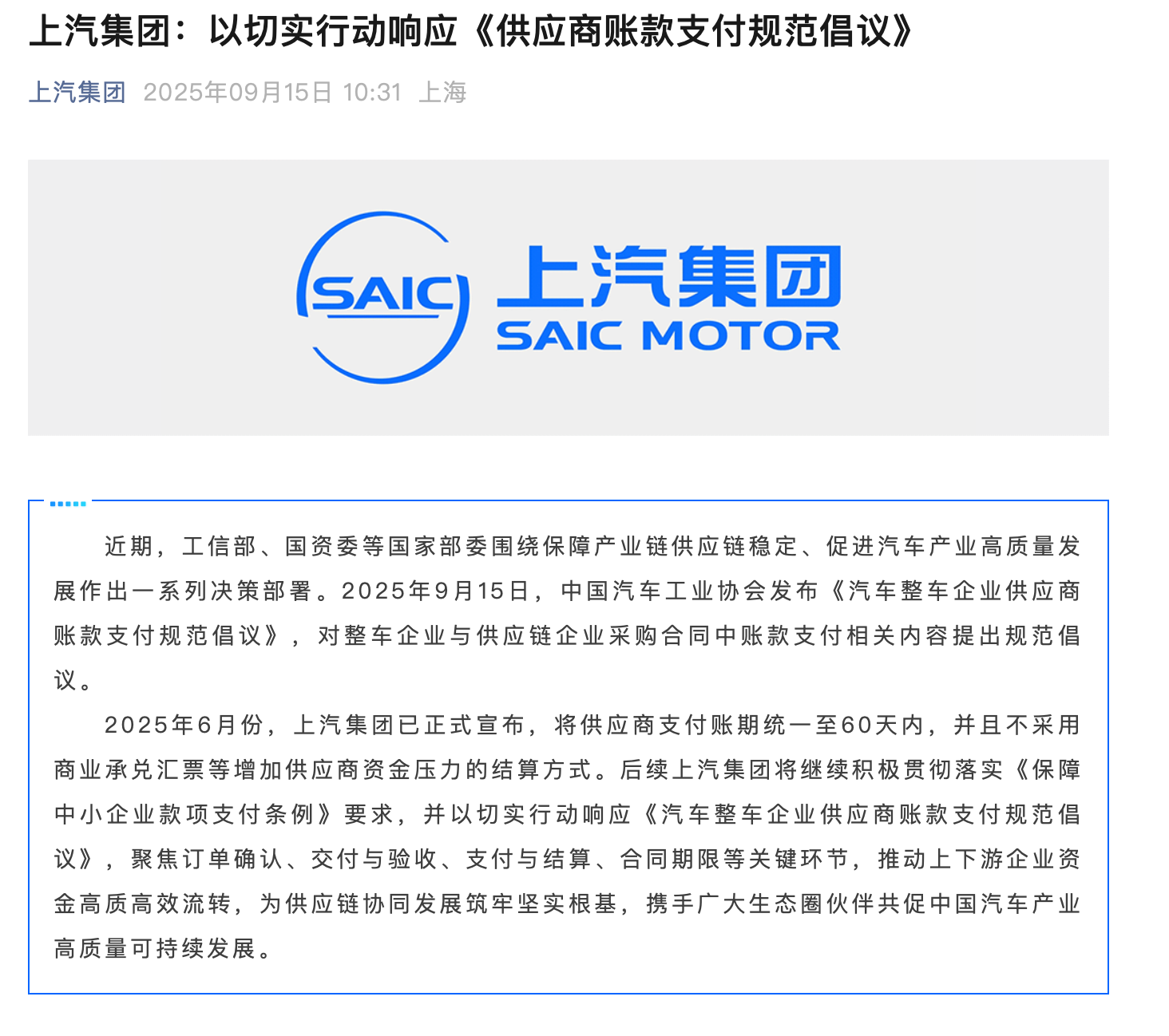 以下為《汽車整車企業供應商賬款支付規范倡議》原文。