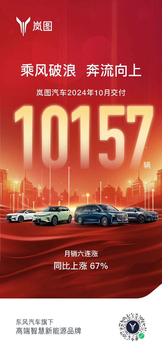 | 月銷六連漲!嵐圖汽車10月銷量10157輛,連續兩月銷量破萬 |