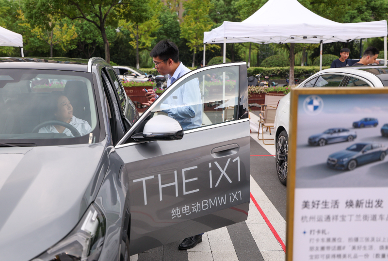 (資料照片)經銷商在消費品以舊換新展會現場向消費者介紹車輛。新華社記者 江漢 攝