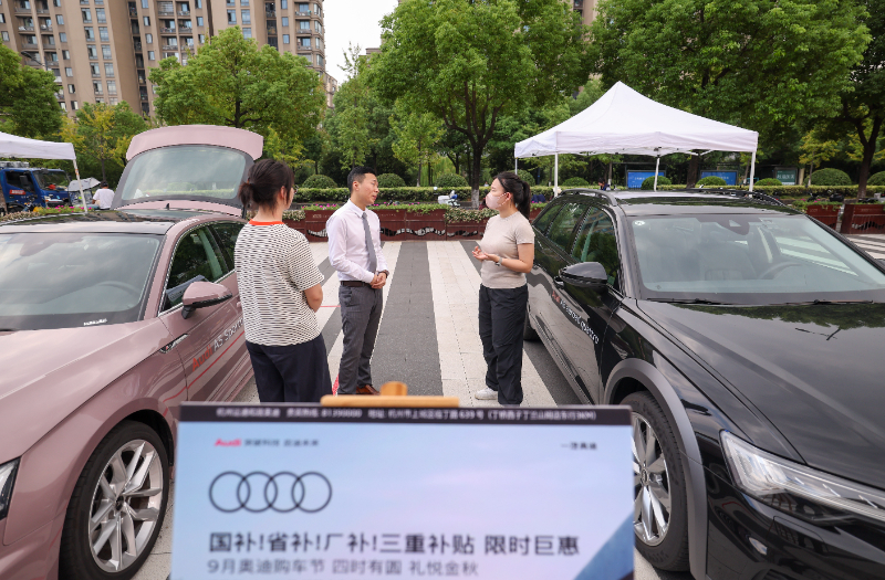 (資料照片)經銷商在消費品以舊換新展會現場向消費者介紹車輛以舊換新政策補貼與品牌優惠的具體情況。新華社記者 江漢 攝