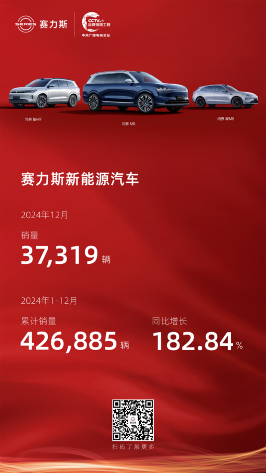 2025年1月1日,賽力斯發布2024年12月產銷快報。數據顯示,賽力斯12月新能源汽車銷量達37319輛;1-12月新能源汽車累計銷量達426885輛,同比增長182.84%。